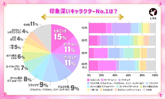お次は、なかでも特に印象深い「平成女児」キャラクターについて人気投票を実施。ときめいたキャラクターNo.1の「たまごっち(15%)」、次いで「セーラームーン(11%)」「プリキュア(11%)」に票が集まりました。