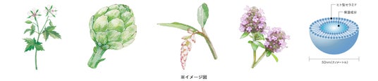 左から)ゲンノショウコエキス、アーティチョークエキス、ゲットウ葉エキス、ワイルドタイムエキス(※8)、セラミドナノスフィア、