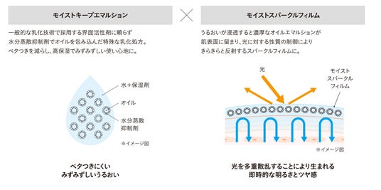 ベタつきを減らしながらも高保湿でみずみずしい使い心地を両立するモイストキープエマルションと、浸透(角層まで)を高め、肌表面にツヤ感をもたらすモイストスパークルフィルムを採用することで、うるおいを閉じ込めながらもみずみずしさや明るさ、透明感・ツヤ感の即時的な体感をもたらします。特殊な乳化技術が叶えた微細エマルション配合の進化系オイルイン。