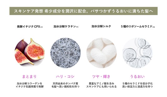 独自CPXの「発酵イチジクCPX」*4、加水分解ケラチン*5、加水分解シルク、5種のリポソーム化セラミド*6を配合。パサつかず、うるおいに満ちた髪へ。