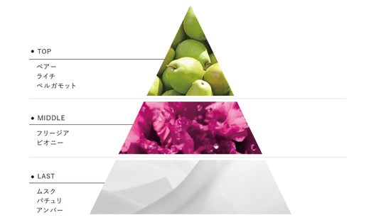 フレッシュなペアーとライチの透明感に、心地よくやわらかなピオニーとアンバーの余韻。