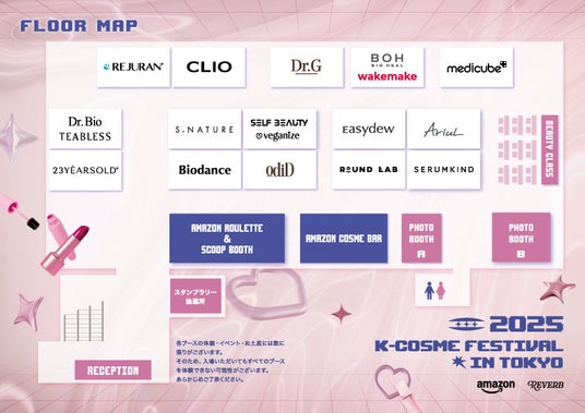 株式会社ギークピクチュアズ(本社:東京都港区、代表取締役:小佐野 保) がプロデュースを行い、JFUN & REVERBが主催する、韓国の大手コスメブランド体験や韓国のトレンドコンテンツを楽しみ尽くせる、日本初進出のポップアップイベント「K-cosme Festival Reverb With Amazon」は、フロアマップを公開。さらに来場者限定で、協賛ブースを10箇所回ると、韓国コスメが当たる抽選にご参加いただけるスタンプラリーを実施いたします。