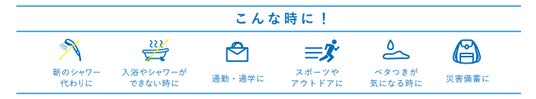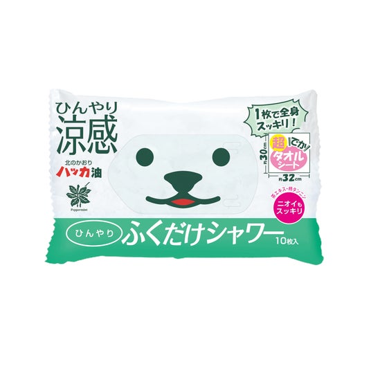 毎年さまざまなメディアに取り上げられております「ひんやりふくだけシャワー」は、約30cm×32cmの「超でかタオルシート」採用した、さっと拭くだけで涼感の「超でかタオルシート」。首すじ、腕、ワキの下、足などの汗やベタつきが気になるところを1枚で拭くことができます。