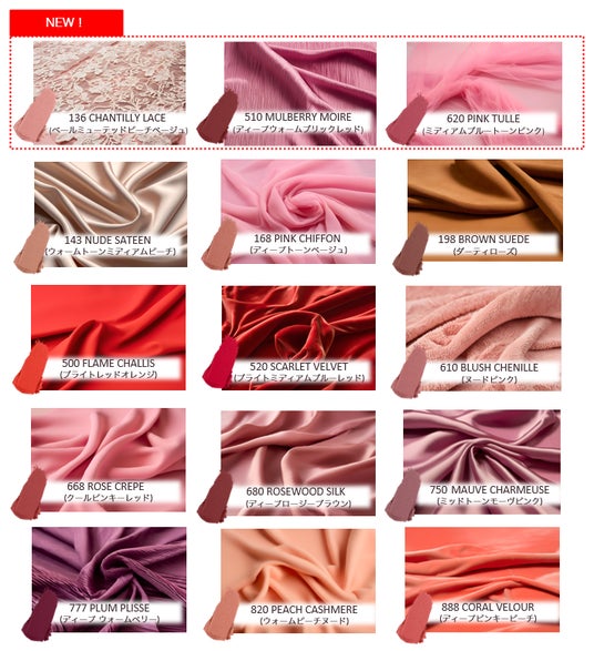 ローラ メルシエ創設者であるローラ・メルシエが見て、触れて、経験した様々な国や土地、食べ物、物体がインスピレーション源となり開発されるシェードやシェードネーム。新しく登場する「ローラ メルシエ キャビア リップスティック」は、布の生地素材からインスパイアを受け、実際に触れた感触や見た目を想起させるシェードネームに。柔らかく軽やかなマットのテクスチャーに着地しながらも、様々な異なる素材の質感を感じられるシェードやシェードネームをお楽しみいただけます。