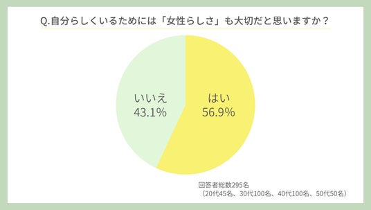 「自分らしくいるために女性らしさも大事だと思いますか?」という質問に対しては、56.9%が「はい」、43.1%が「いいえ」と回答しました。