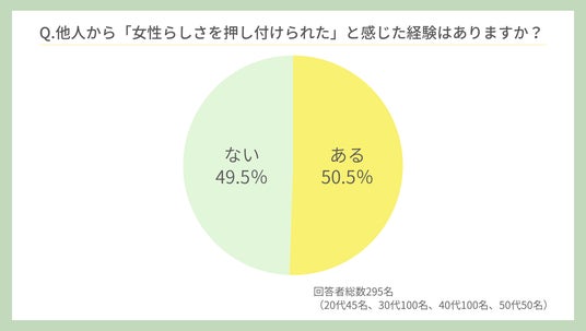 アンケートにて、他人から「女性らしさを押し付けられた」と感じた経験の有無を尋ねたところ、50.5%が「ある」と回答しています。