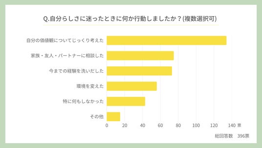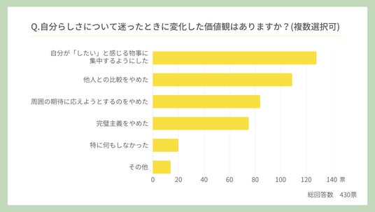 調査で「自分らしさについて迷ったときに変化した価値観はありますか?」と尋ねたところ、もっとも多かったのは「自分が「したい」と感じる物事に集中するようにした」(128票)でした。