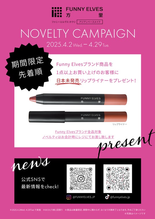 中国発のベースメイクブランド「FUNNY ELVES方里(ファニーエルヴス ホウリ)」(代表取締役社長:楊菊、本社:浙江省杭州市濱江區西興街道聚工路19号8号館15階1512号室)は、2025年4月2日(水)~4月29日(火)の期間、@cosme TOKYOで初の期間限定キャンペーンを1階・階段付近特設コーナーにて開催いたします。