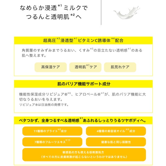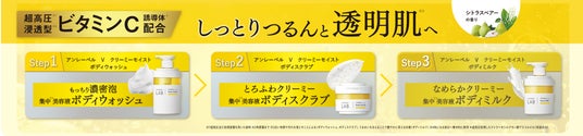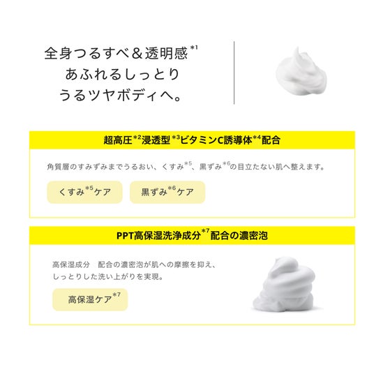 *1超高圧加工処理装置を用いた原料 *2角質層まで *3超高圧処理したテトラヘキシルデカン酸アスコルビル(保湿成分) *4(ボディウォッシュ、スクラブ)古い角質や汚れを落とすことによる、(ボディミルク)うるおいを与えることで艶やかに見える印象 *5気になる部分へ集中的に使用