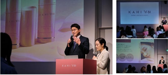 発表会の冒頭では、KOREATECH代表 イ・ドンヨル氏が登壇し、「KAHIというブランド名は、ハングルの始まりと終わりの文字をとって名付けられ、“美しさの始まりから終わりまで”を意味しています。また、ハングルは “誰もが簡単に”習得できるように作られた文字で、KAHIというブランド名もその成り立ちを見習い名付けられました。」とブランドの原点を語りました。