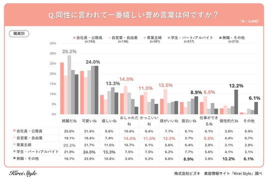 」、「仕事ができるね」などの回答率が高くなる結果となりました。自営業・自由業の場合、自身のスキルや能力が成果や収入に直結するため、外見だけでなく、その人のセンスや独自性、リーダーシップなどを評価する言葉がモチベーションを高める要因になっていることが考えられました。