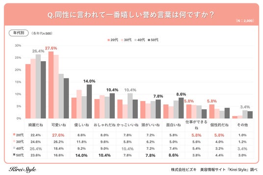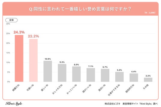 全国の20代~50代の女性2,000人を対象に、「同性に言われて一番嬉しい褒め言葉は何ですか?」というアンケートを実施したところ、最も多かった回答は「綺麗だね」で24.3%となりました。次いで、「可愛いね」が22.2%、「優しいね」が10.9%と続く結果となりました。また、「その他」として「若く見える」、「肌が綺麗」、「スタイルがいい」などの回答が得られました。