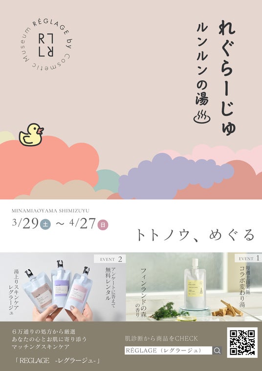 本イベントでは、通常ECサイトでしか手に入らない「REGLAGE(レグラージュ)」の商品を、期間限定で「南青山 清水湯」にてレンタルお貸出ししているスキンケアにて、商品をご自身のお肌で直接体験できる特別な機会をご用意しています。