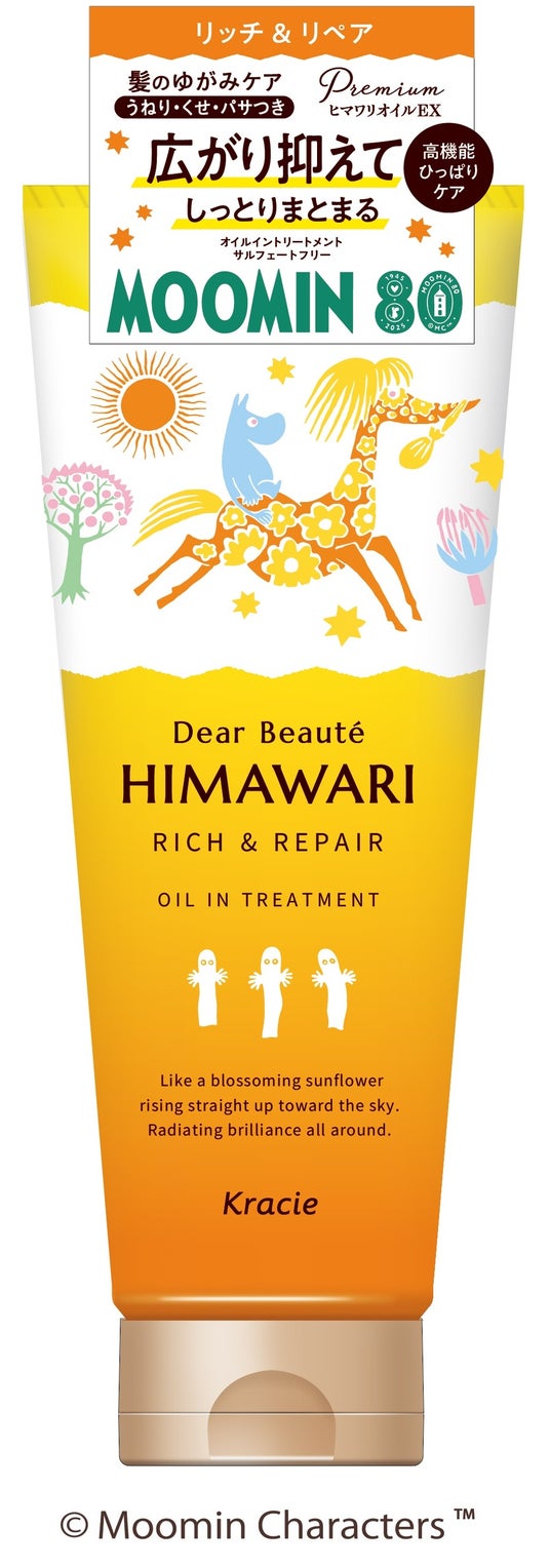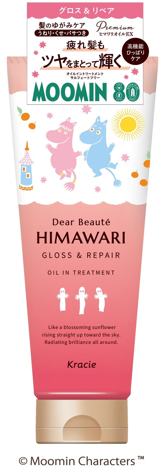 ブランド共通特長成分「プレミアムヒマワリオイルEX」配合で、髪ゆがみの原因を髪の内部と外側からトータルケアする「ディアボーテHIMAWARI」。「オイルイントリートメント」は、「高機能ひっぱりケア」を採用し、ブラッシングなど日常のひっぱりによって起きるゆがみをケアします。また、「湿気ケア」もできるので、湿度が高まる夏季に向け、デイリーケアに取り入れていただくのがおすすめです。髪悩みと仕上がりで選べる3ラインが「ムーミン」キャラクターで彩られ、思わず手にとりたくなるデザインで素直な髪を応援します。
