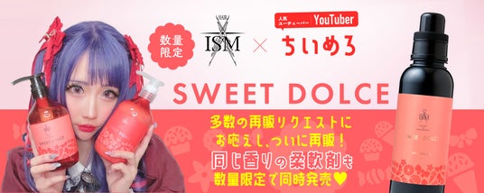 株式会社モンシュシュ(本社:東京都世田谷区 代表:小川カヨ)は、進化するヘアサロンISM×人気YouTuberちいめろとのコラボアイテム『ISM SWEET DOLCE(イズム スイートドルチェ)』のシャンプー&トリートメント限定セットと柔軟剤を数量限定、ドン・キホーテ系列店舗限定で発売いたします。