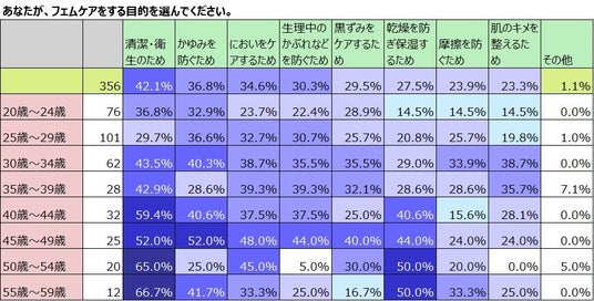 フェムケアをしている人に、フェムケアを行う目的を聞きました。(複数選択のため、合計が100%にはなりません。)最も多いのは「清潔・衛生のため」で42.1%、高齢になるほど、割合が増加する傾向があります。次に多いのは、「かゆみを防ぐため」で36.8%です。続くのが「においをケアするため」、「生理中のかぶれなどを防ぐため」です。「乾燥を防ぎ保湿するため」の項目は、年齢が高いほど増加する傾向がありました。「黒ずみをケアするため」や「肌のキメを整えるため」など、肌の外観に関わる目的でケアをしている人も多いことがわかります。特に45歳~49歳は多くの項目を選択している傾向がありました。女性ホルモンの変化や生理・閉経など、年齢による変化も多いことから目的も変化していくものと考えます。