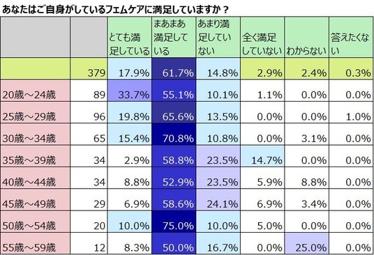 次にフェムケアをしていると答えた379名にフェムケアの満足度を聞きました。全体では、「とても満足している」が17.9%、「まあまあ満足している」61.7%と合わせて79.6%と約8割が満足しています。これは、これまで行ってきた、スキンケアの満足度などと比較しても高い割合です。