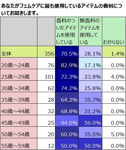 フェムケアを行っている人に、使用しているアイテムを選択してもらいました。専用品を使用している人は76.1%と約8割、ボディケア品を兼用して使用している人が20.8%と約2割でした。n数が少ない35歳以上は参考値となりますが、若年層ほど専用品の使用者が多く、92.1%と9割を超えています。ボディケア品を兼用してケアしている人は5.3%にとどまりました。年齢を重ねるにつれ、ボディケア品を兼用で使用している人の割合が増えていく傾向があります。最後に、フェムケアに使用しているアイテムの香りについて聞きました。全体では、香料のついたアイテムを使用している人が70.5%で、無香料のアイテムを使用している人は28.1%でした。年齢が高い層の方が無香料のアイテムを使用する人が多いようです。