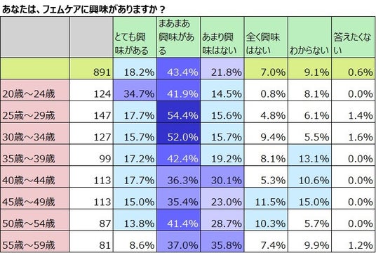 次に、「フェムケア」の言葉を知っていて意味も知っていると答えた人と、「言葉は知っているが意味は知らない」と答えた891名に、「フェムケア」に興味があるか否か聞きました。全体では、「とても興味がある」18.2%で「まあまあ興味がある」43.4%を合わせた61.6%と6割を超える人が興味があると答えています。興味がないのは、「あまり興味がない」21.8%と「全く興味がない」7.0%を合わせた28.8%で、興味がある人は興味がない人の2倍以上でした。