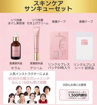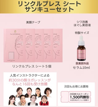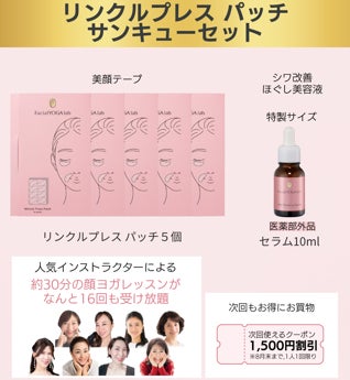 FacialYOGA Labのスキンケアとリンクルプレス(美顔テープ)のセットに、顔ヨガオンラインレッスンが無料で受け放題となる、非常にお得な期間限定セット商品を全3種類発売いたします。