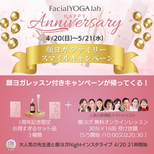 アップリフト合同会社(本社:神奈川県横浜市鶴見区、代表:中嶋かよこ)は、スキンケアブランド 「FacialYOGA lab(フェイシャルヨガ ラボ)」が生誕1年を迎えることを記念し、2025年4月20日(日)から5月21日(水)までの期間、顔ヨガ協会のメンバーとともに『顔ヨガファミリー スマイルキャンペーン』を実施します。