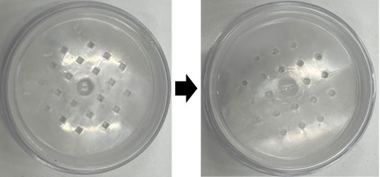 商品内蓋の形状を正方形から丸に変更して直径をやや大きくすることで、パウダーが出やすくなるように改良しました。