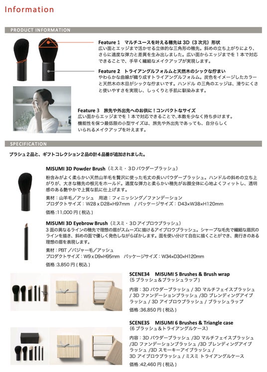 熟練の職人技により3D(立体的な三角形)に整えられた穂先フォルムと斜めの立ち上がりにより、毛の適度な弾力が生まれ、あわただしい旅先や外出先でも手早く、かつ繊細なメイクアップが実現。