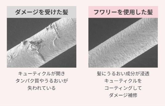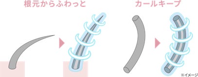 乾燥やダメージを受け髪のキューティクルが開き、タンパク質やうるおいが失われてスカスカと空洞化するとハリ・コシがなくなります。そんなハリ・コシが無くなり、巻き髪を長時間キープできなくなった髪に、うるおい成分を浸透させ、ハリ・コシ成分「コラーゲンペプチドD※1」が髪をコーティングすることで、根元の立ち上がりや巻き髪キープをサポートします。