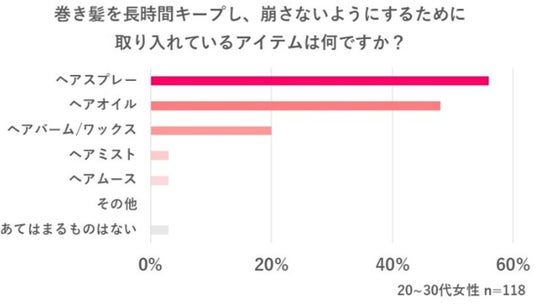 「巻き髪のキープ方法」を質問したところ、巻き髪を長時間キープするために最も使用されているアイテムは「ヘアスプレー」であることが分かりました。髪をしっかり固定し、風や湿気などの外的要因から巻き髪を守ることができるため、多くの女性に支持されているようです。