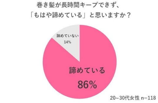 日々、巻き髪のキープ力をアップさせるために様々な工夫を凝らしている女性が多い中で、巻き髪をする女性118人のうち約86%の女性が、髪の巻きが取れることを「もはや諦めている」と回答しました。ヘアスプレーやヘアオイルを使用し、工夫を凝らしても尚、日常的に巻き髪をキープするのが難しいと感じている女性が多くいるようです。巻き髪がキープできないだけでなく、いつの間にか髪がボサボサになってしまい、せっかくのお出かけシーズンにも関わらず気分が落ちてしまう方も多いのではないでしょうか。