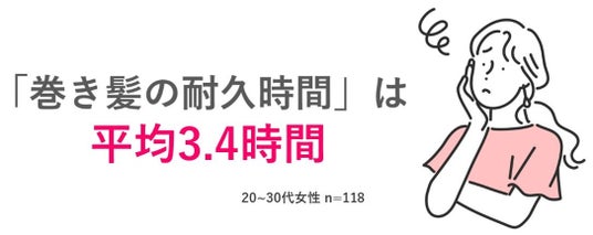20~30代の女性300人のうち、「日頃、ヘアアイロンなどで髪を巻いている」と回答した女性118人に対し、「巻き髪をしたときの耐久時間」を調査しました。その結果、平均の体感時間は3.4時間であることが分かりました。お出かけシーズンの春、朝から身なりを整えて外出をしたとしても、午前中までしか巻き髪のキープが出来ないことに不満を感じている方も多いのではないのでしょうか。