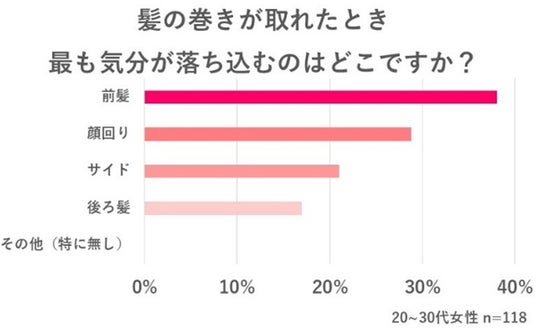 調査によると、髪の巻きが取れた際に最も気分が落ち込む部分は「前髪」であることが分かりました。前髪は顔の印象を大きく左右するため、崩れると全体の第一印象にも影響を与えやすくなります。特に春には、新しい職場など、環境の変化で初対面の人と会う機会が増える季節であることから、前髪を気にする人も増えると考えられます。