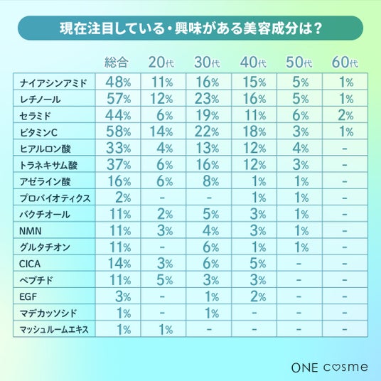 ビタミンCやレチノール、ナイアシンアミドなど、すでに多くの人に支持されている定番成分に加え、NMNやPDRNといった新しい美容成分にも関心が高まっていることがわかりました。