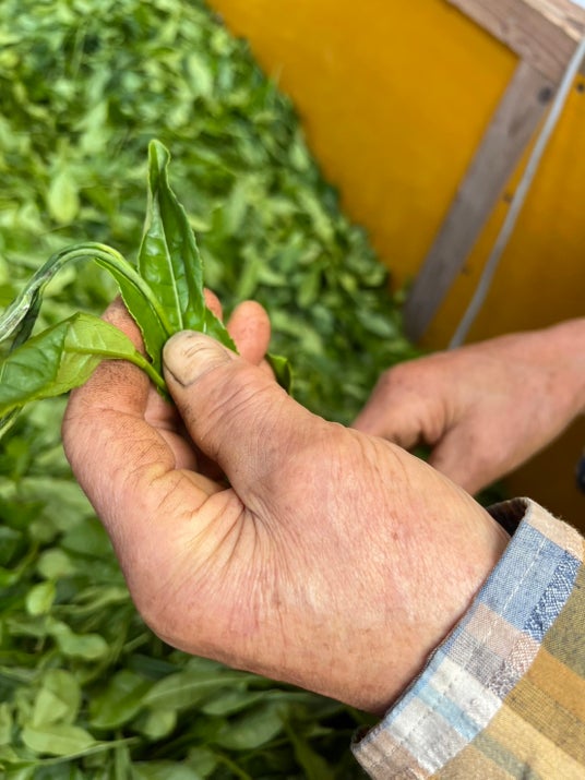 茶葉の声?を聴く大橋さんと依口(笑)