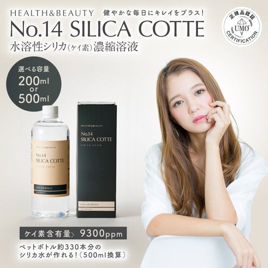 健康・美容で注目されているシリカ(ケイ素)を効率よく適切に取り入れるため、液体サプリメントとして登場した「No.14シリカコッテ」。シリカ(水晶石)の燃焼と特殊なフィルターの使用によって抽出されたアモルファス(非晶質)水溶性ケイ素の濃縮液であり、4種類のミネラル(ナトリウム・鉄・マグネシウム・マンガン)が含まれた溶液となっています。