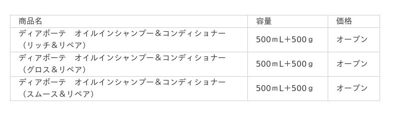 髪ゆがみの原因を髪の内部と外側からトータルケアする「ディアボーテHIMAWARI」は、ブランド共通特長成分「プレミアムヒマワリオイルEX」配合*1で、髪の内部にうるおいをあたえ、髪の外側のキューティクルのはがれをコートします。広がり抑制処方の「リッチ&リペア」、うるおい&ツヤUP処方の「グロス&リペア」、指通りなめらか処方の「スムース&リペア」と、髪悩みと仕上がりで選べる3ライン。