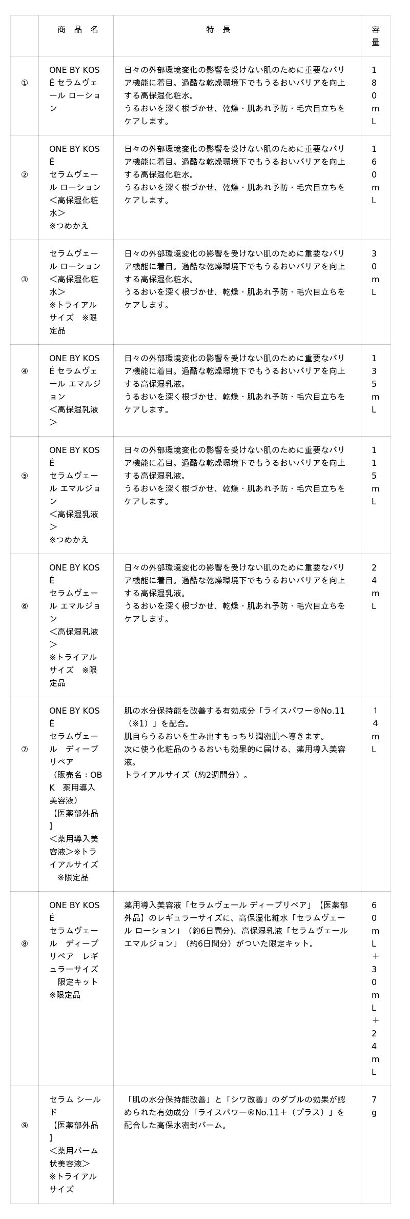『ONE BY KOSE』は、乾燥やシミ、シワ、毛穴といった多様な肌悩みに対し、それぞれに特化して解決する高効能アイテムを揃えたブランドです。その第一弾として2017年1月に発売した「薬用保湿美容液」は、日本で初めて「肌の水分保持能改善」の効能が認められた有効成分「ライスパワー(R)No.11(※1)」を配合。使うたびにうるおいを感じるその確かな効果感が評価され、2度のリニューアルを経て、現在はブランドの顔となる美容液「セラムヴェール ディープリペア」として進化し、現在、コーセーの保湿美容液で最も売れる商品(※2)として、幅広い顧客層から高い支持を得ています。