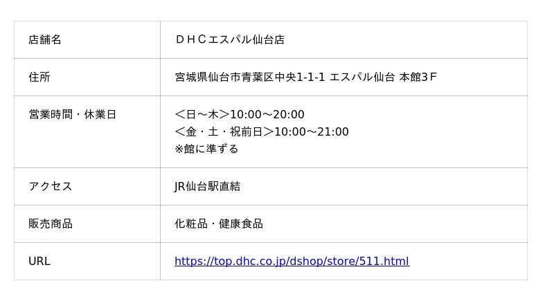 株式会社ディーエイチシー(本社:東京都港区、代表取締役社長:宮崎緑、以下:DHC)は、美と健康をトータルサポートする新店舗として、宮城県に「DHCエスパル仙台店」を、2025年8月1日(金)にOPENします