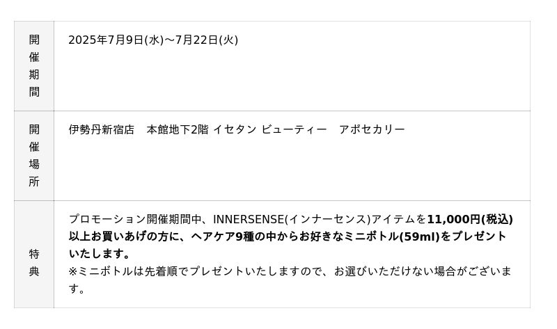 株式会社マッシュホールディングス(本社:東京都千代田区/代表取締役社長:近藤広幸)のグループ会社である株式会社インナーセンスアジア(本社:東京都千代田区/取締役社長:中谷昌弘)は、2025年7月9日(水)から22日(火)まで伊勢丹新宿店 本館地下2階 イセタン ビューティー アポセカリーにてプロフェッショナルクリーンヘアケアブランド「INNERSENSE(インナーセンス)」の新商品ヘアリニュースカルプヘアバス、ヘアリニュースージングコンディショナー、限定コラボキットLOVECHROME×INNERSENSE Limited Kitの先行発売POP UPを実施します。該当商品は2025年7月9日(水)より先行発売し、2025年7月11日(金)より全国発売をいたします。