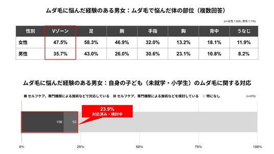 現在、衛生・美容意識の高まりを受け、デリケートゾーンの脱毛は性別・年齢を問わず広がりを見せています。ウィルミナが直近で行った「ムダ毛の悩みに関する意識調査」*では、ムダ毛に悩んだ経験がある体の部位は、男女ともにVゾーンが2位という結果に。同調査では、ムダ毛に悩んだ経験がある人の約4人に1人が、自身の未就学・小学生の子どもに対し脱毛を行うことに前向きであることが明らかになっており、脱毛自体がより身近な存在であり、脱毛を行う年齢層の低年齢化も進んでいることが伺えます。