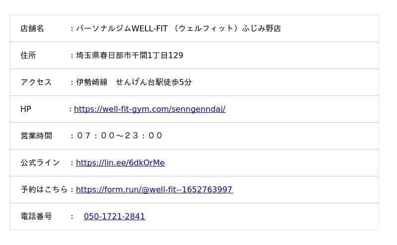 HP :https://well-fit-gym.com/shinntokorozawa/