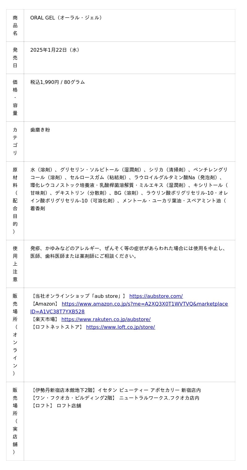 理想的な腸内環境を追求し、腸内細菌の研究をベースに腸ケア商品を開発するAuB(オーブ)株式会社(東京、鈴木啓太代表取締役)は、腸内環境の専門家が生み出した歯磨き粉「ORAL GEL(オーラル・ジェル)」を、雑貨店「ロフト」で販売開始します。