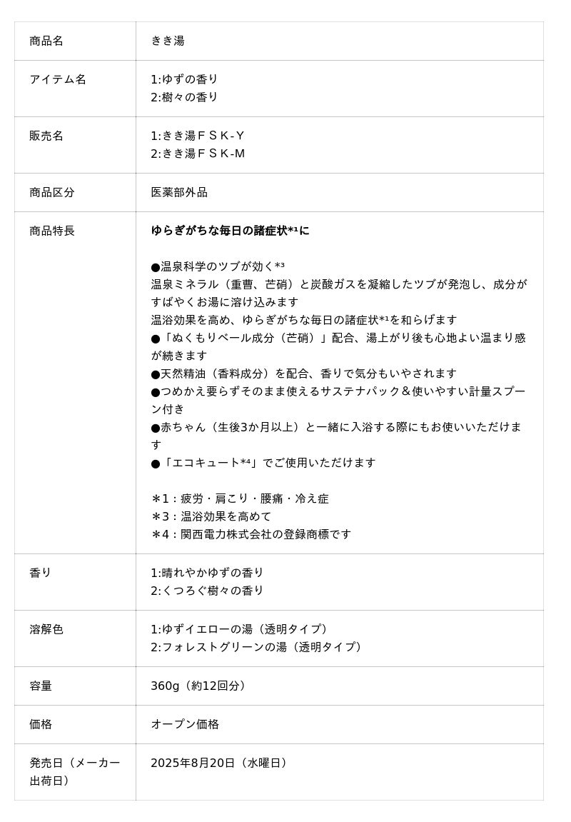 株式会社バスクリン(本社:東京都千代田区 社長:三枚堂正悟)は、気温差やストレスなどでゆらぎがちな毎日の諸症状*¹に着目して開発した炭酸入浴剤「きき湯 香る炭酸湯 ゆずの香り」「きき湯 香る炭酸湯 樹々の香り」を8月20日(水曜日)より新発売いたします。温泉ミネラルと炭酸ガスが温浴効果を高めて、日々の気になる諸症状*¹を緩和します。さらに、天然精油*²の香りで、気分まですっきり晴れ渡るようなお風呂時間をお楽しみいただけます。