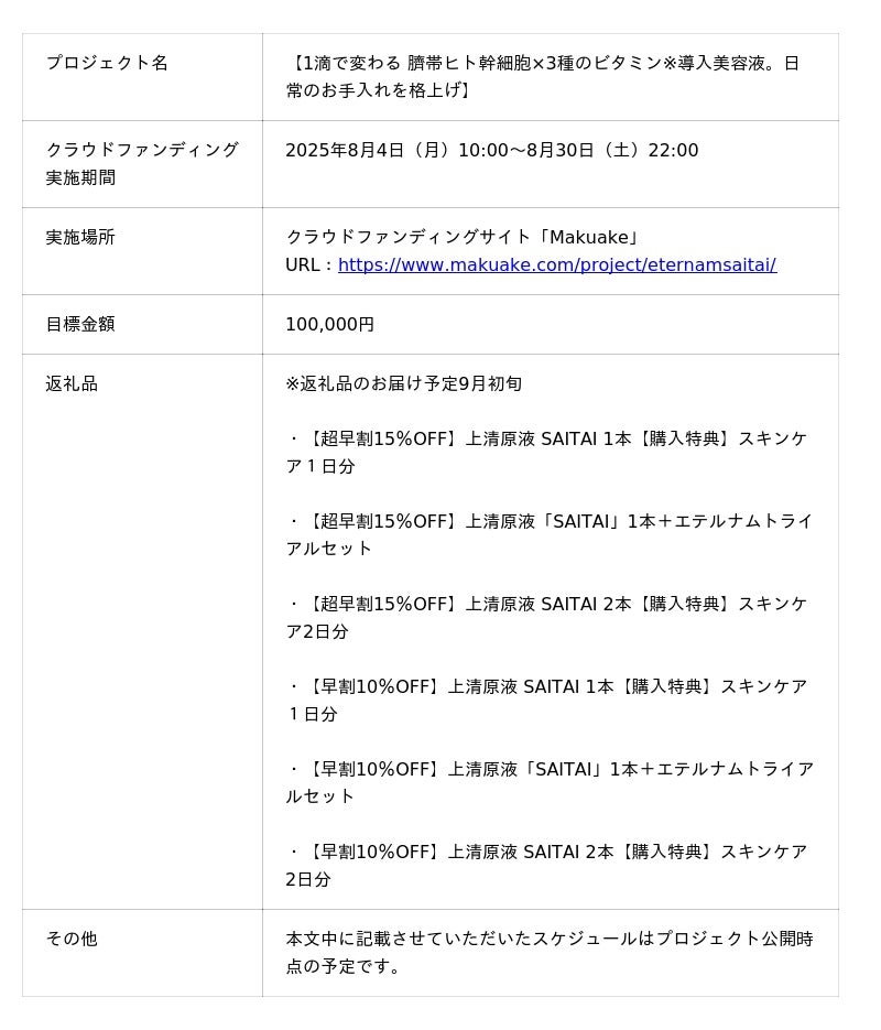 『永遠の美しさへの夢が、夢に終わらない未来を創りあげること』を使命に掲げる、化粧品の研究開発・製造販売を行う株式会社エテルナム(本社:東京都渋谷区、代表取締役:松本隆明)は、2025年8月4日(月)10:00、クラウドファンディングサイト「Makuake」にて、1品追加するだけで日常のスキンケアを格上げする短期間のマルチスポットケア「上清原液 SAITAI」の先行販売を開始いたしました。