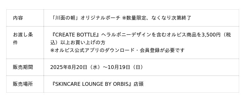 『SKINCARE LOUNGE BY ORBIS』店頭限定でノベルティをご用意しております。『CREATE BOTTLE』ヘラルボニーデザインを含むオルビス商品を3,500円(税込)以上お買い上げの方に先着順でヘラルボニー契約作家のアートを起用したオリジナルポーチをプレゼントいたします。