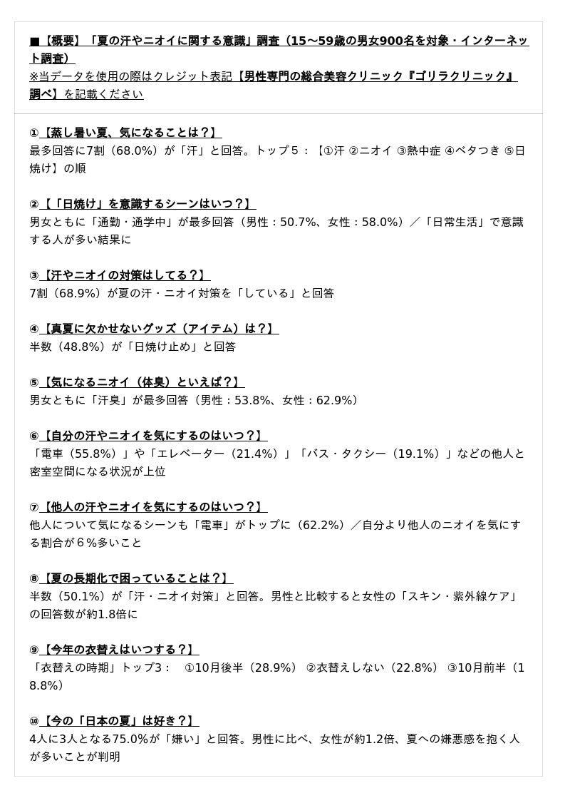 そこで、全国22院展開する男性専門の総合美容医療「ゴリラクリニック」(医療法人社団十二会/東京都新宿区、稲見文彦総院長、以下「当院」)は、2025年8月1日の1日間、10~50代の男女900名を対象に【汗やニオイに関する意識調査】を実施しました(インターネット調査)。