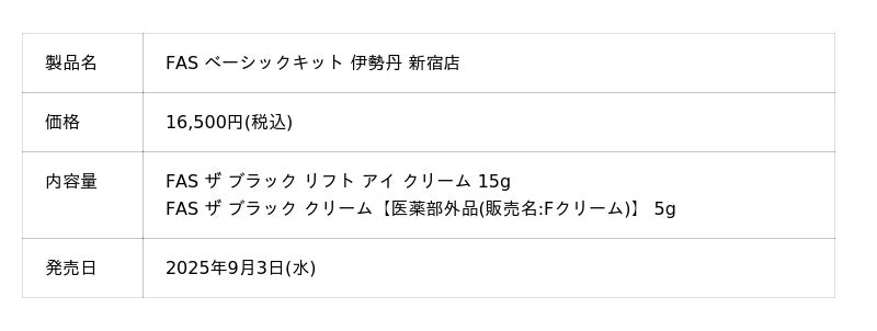 今回のPOP UPでは、9月10日(水)より本発売となる「FAS ザ ブラック リフト アイ クリーム」を含む2種類の特別キットをご用意しています。この機会にぜひお立ち寄りくださいませ。
