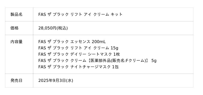 9月10日(水)より本発売となる新製品「FAS ザ ブラック リフト アイ クリーム」と、「FAS」のベストセラー*⁵商品「FAS ザ ブラック エッセンス」の現品セットに、シートマスク1枚、ブラッククリームのミニサイズ、ナイトチャージマスク1包が付いてきます。「FAS」のデビュー製品から新作まで、ブラックシリーズのアイテムを広くお試しいただけるスペシャルなキットです。