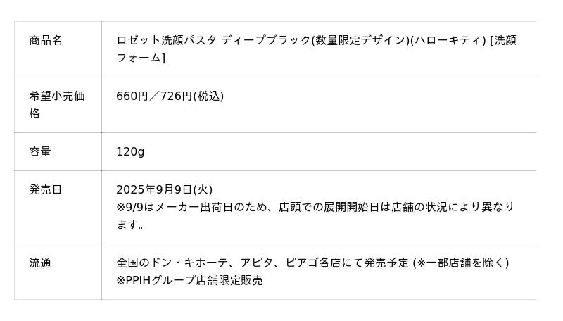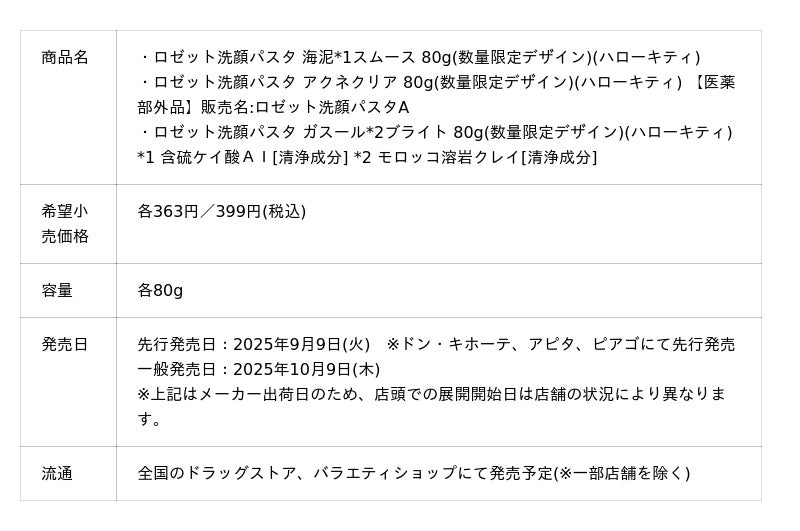 ロゼット株式会社(本社:東京都品川区、代表取締役社長:藤井敬二)は、95年以上続くロングセラー洗顔ブランド『ロゼット洗顔パスタ』より、株式会社サンリオの大人気キャラクター「ハローキティ」とコラボレーションしたオリジナルデザインのクレイシリーズ4種を数量限定で発売いたします。2025年9月9日(火)よりドン・キホーテ、アピタ、ピアゴにて先行発売(※「ディープブラック 120g」のみ店舗限定販売)、10月9日(木)より全国のドラッグストア、バラエティショップ(※一部店舗を除く)などで順次販売を開始いたします。各種類ごとに様々な表情の「ハローキティ」やリボンのカラーが楽しめるかわいらしいデザインに仕上がっており、毎日の洗顔タイムをより楽しく彩ります。