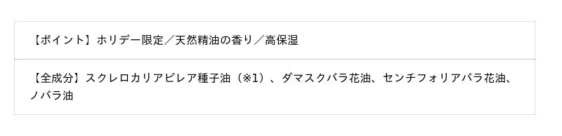 限定ローズの香りは贅沢に3種のバラの天然精油をブレンド。気品あふれるダマスクバラ、優雅な甘さのセンチフォリアバラ、素朴なやさしさのノバラが織りなす華やかで豊かな香りは、一日の終わりのスキンケアタイムを幸福な時間へと導きます。さらにリッチな気分を味わえるゴールドのキャップもポイント。